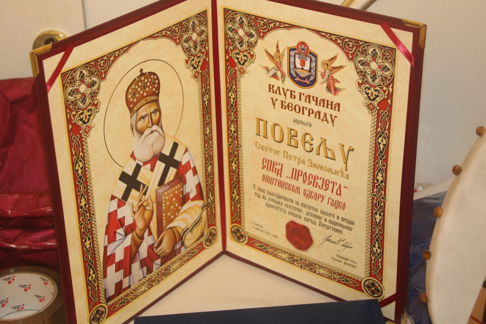 Повељу је уручила потпредсједница Клуба Гачана, проф. др Јадранка Милошевић, дугогодишњем предсједнику „Просвјете“ Радомиру Вучковићу.