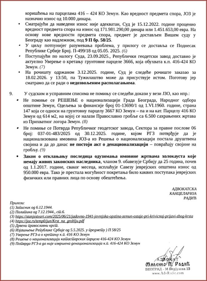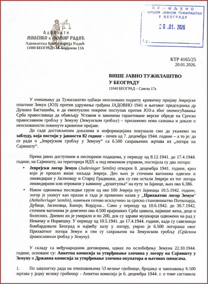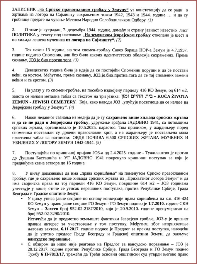 ЗАПИСНИК смо недавно пронашли у Архиву Војводине и очекујемо да се постави на ударно место како би се избегли неспоразуми који трају 82 године. Због тих неспоразума Јеврејска општина Земун поднела је Кривичну пријаву против др Душана Басташића, председника УГ ЈАДОВНО 1941 из Бања Луке. Полазећи од те пријаве, Треће основно јавно тужилаштво и Више јавно тужилаштво у Београду предвидели су казну до 16 година затвора.