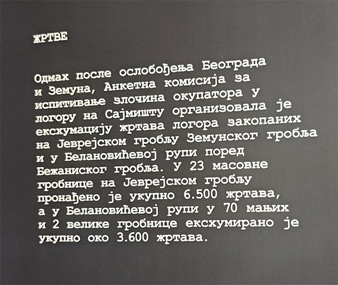 „NA PROSTORU STAROGA SAJMIŠTA NEMAČKI GESTAPO OSNOVAO JE 1941 GODINE LOGOR „SAJMIŠTE“ U KOME JE, UZ POMOĆ DOMAĆIH IZDAJNIKA, SVIREPO MUČENO I UBIJENO PREKO 40.000 LJUDI IZ SVIH KRAJEVA NAŠE ZEMLJE“