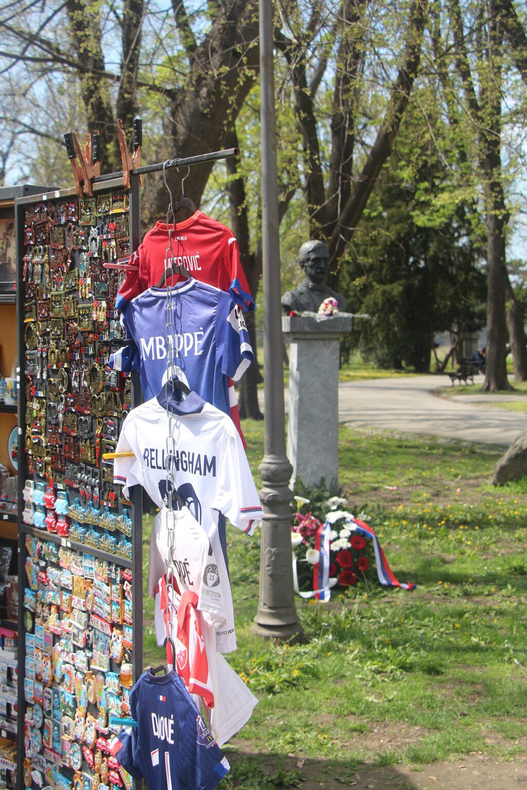 Више од 80 поштовалаца Јована Дучића окупило се на Калемегдану, али призор је био више него поражавајући: између нагомиланих дрвених киоска, импровизованих излога с навијачким шаловима и плагијатима дресова бјелосвјетских фудбалера, те све већег броја празних гајби и палета већина присутних није могла да види ни бисту Јована Дучића, ни говорнике.