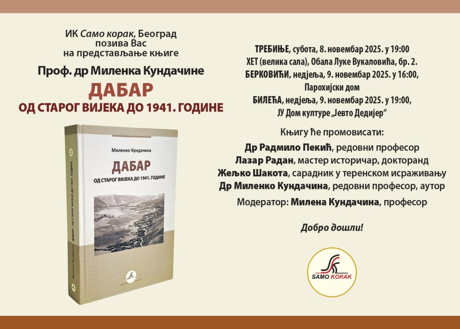 Публику је поздравио и сам аутор, проф. др Миленко Кундачина, који се деценијским научним радом, сабраним у овој монографији, желио одужити родном Дабру и Херцеговини. Програм представљања књиге успјешно је водила и обликовала мр Мирјана Пајић.