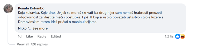 „Која кукавица. Које дно. Увијек се мораш скривати иза других јер сам немаш храбрости преузети одговорност за властите ријечи и поступке. И још ТИ који си успио повезати усташтво и твоје лузере с Домовинским ратом идеш причати о манипулацијама.