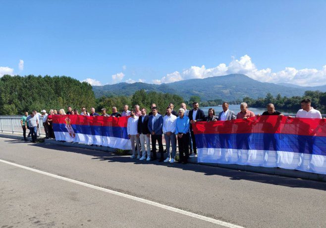 Грађани и руководства општина Братунац и Љубовија у Српској и Србији на мосту Братољуб спојили су заставе симболишући Дан српског јединства, заставе и слободе.